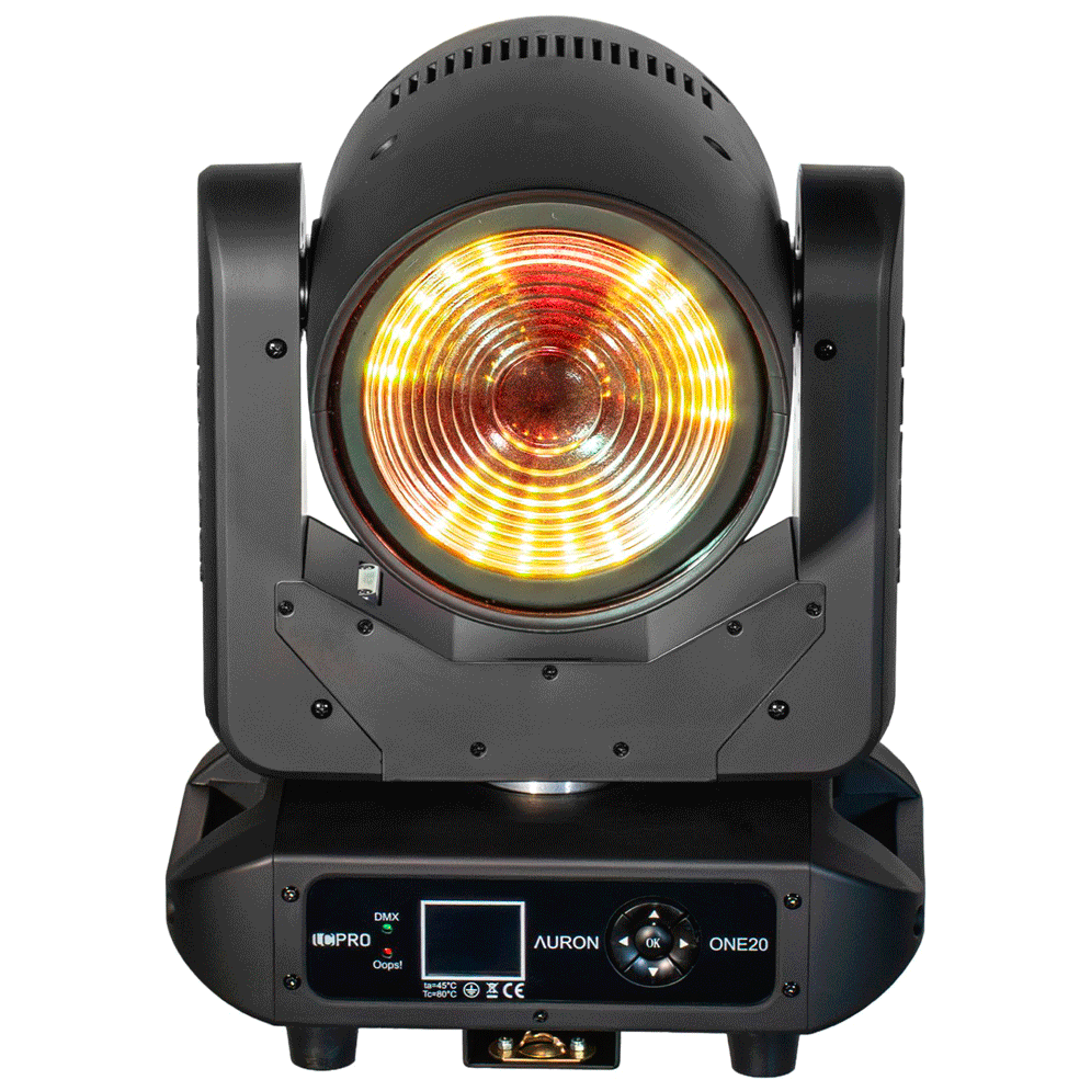 Mit einem kompakten Gehäuse bei nur 8,3 kg Gewicht und motorischem Pan/Tilt (540°/220°), DMX-512 (3- & 5-polig), RDM, Sound- und Auto-Modus sowie intelligenter Lüftung ist der AURON ONE20 nicht nur leistungsstark, sondern auch zuverlässig für den harten Touring- und Verleihbetrieb.