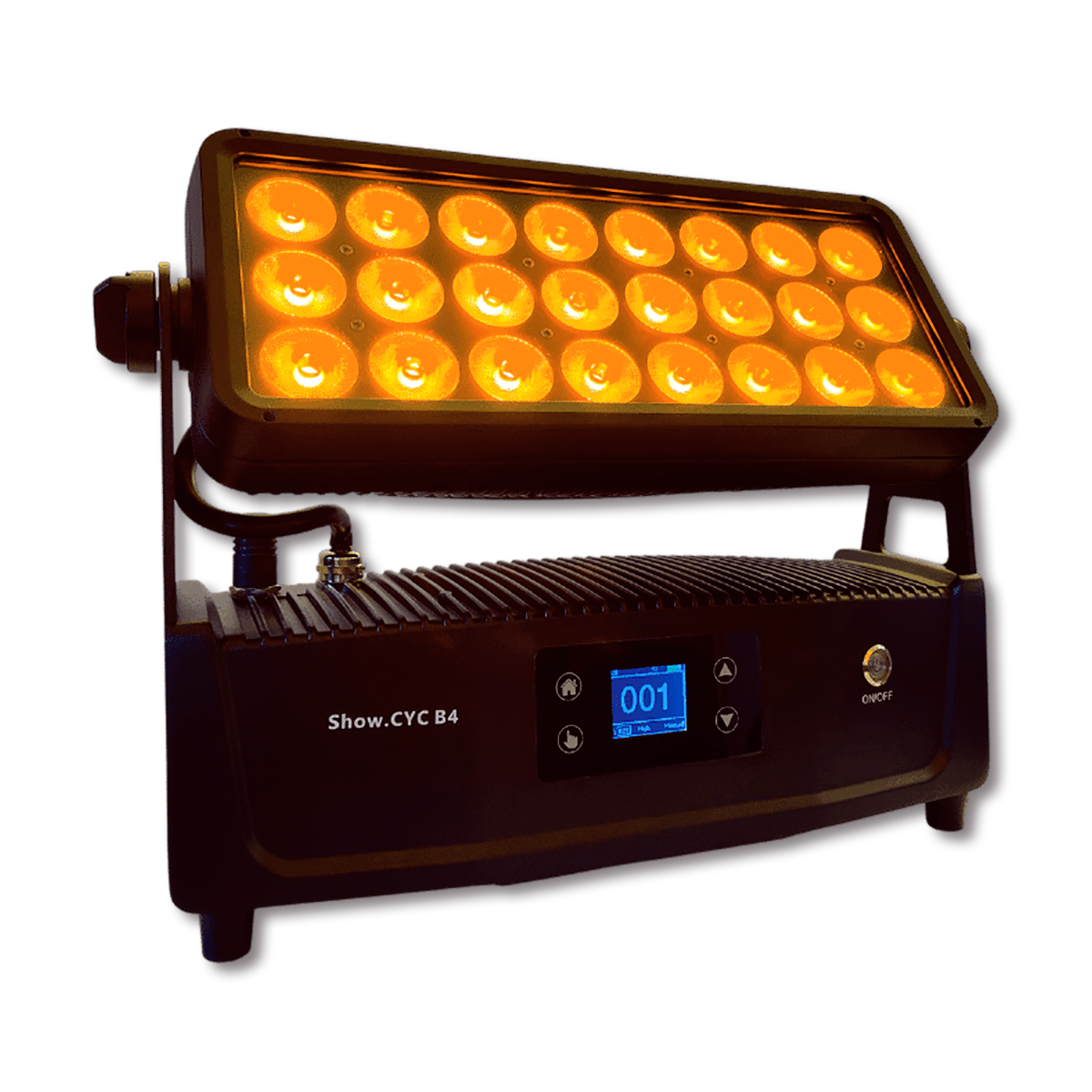 Der Show.CYC B4 überzeugt mit 24×20 W RGBL High Power LED Engine und liefert beeindruckende Helligkeit sowie brillante Farbmischungen. Mit dem bidirektionalen LumenRadio Timo Two FX W-DMX & CRMX Modul ist eine zuverlässige, drahtlose Steuerung für maximale Flexibilität möglich.