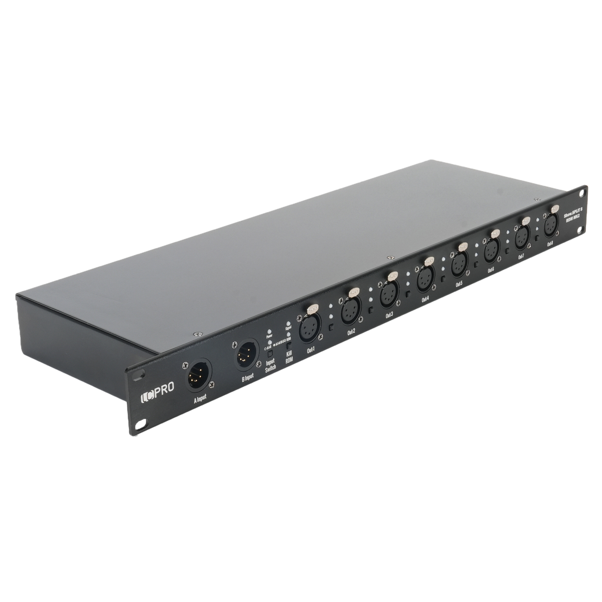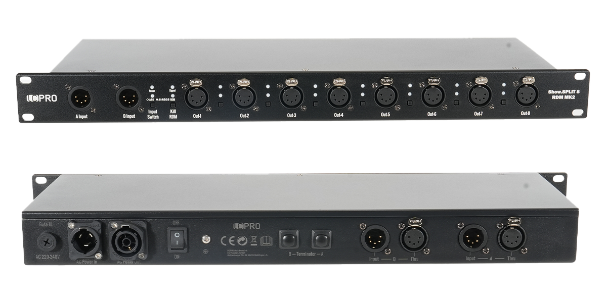 Die interne Signalaufbereitung mit separatem Treiber pro Ausgangsport sorgt für eine stabile und latenzfreie DMX-Verteilung ohne Datenjitter. Galvanische Trennung schützt vor Erdschleifen, während ein zuschaltbarer Abschlusswiderstand je DMX Linie A/B saubere Leitungsabschlüsse ermöglicht (DMX-Termination). Der schaltbare RDM-Filter verhindert Konflikte in gemischten Setups. Das Gerät lässt sich auch im Ganzen Schalten (Kill RDM). Das Gerät ist für eine Netzspannung von AC 100–240 V ausgelegt und kommt mit geringer Leistungsaufnahme aus.